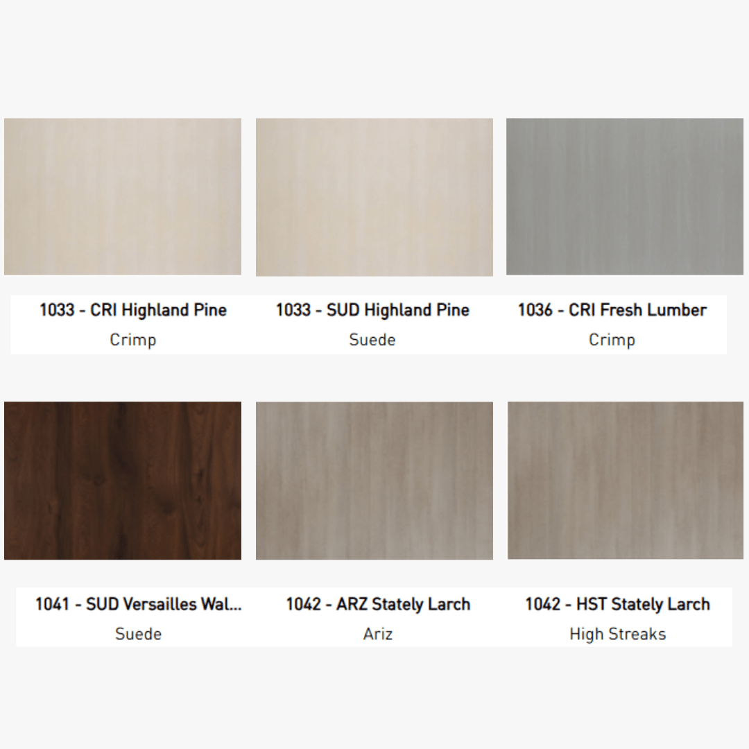 | VARIATIONS | 1024 FASHIONED TIMBER, 1031 G ELM GLOSSY, 104 CREAM SUEDE, 1040 COUNTRY LIGHT, 1041 VERSAILES WALNUT, 1048 HIMALAYAN OAK, 1053 GL SIENNA WOOD, 1057 VIENNA WALNUT, 1057 CM VIENNA WALNUT, 1060 CHERRY LITE, 1063 BROWNIE BEACH, 1067 PIXLED PLANK WALNUT, 1069 SUNBAKED ZEBRANO, 1071 MOONSHINE, 1072 SUGARCOAT MAPLE, 1090 PLUSH GROVE, 1095 VINTAGE WALNUT, 1097 LIVID LUMBAR, 1140 BEIGE, 1413 HONEY CRISP APPLE, 1437 SCARLET OAK, 1439 OREGON PINE, 1442 AFRICAN ZEBRANO, 1443 MORNING DEW, 1448 DIVINE OAK, 1449 OAK RIPPLE, 1463 LACQUERED TEAK, 1464 BLAZING TEAK, 1504 FROSTY TEAK, 1552 BEIGE BRAID, 1702 CHERRY, 1840 AUSTRIAN WOOD, 1860 DARK WOOD, 1971 LEAD, 401 KJ BLACK SUEDE, 5566 CLEAR MESH, 6541 SOFT BEACH, 6555 COVER SNOW, 7414 MACRO LINE, 7510 DARK TEAK, 7518 CHERRY MISTIC, 7521 SUPPLE GREY, 7527 WALNUT CROWN, 7533 NOBLE BROWN, 7537 AUTHENTIC ZEBRANO HST, 7540 SWISH STRIPED, 7593 CALM WOOD, 7604 SILVERLINES, 7605 MYSTIC BAR, 9032 STEEL METAL |